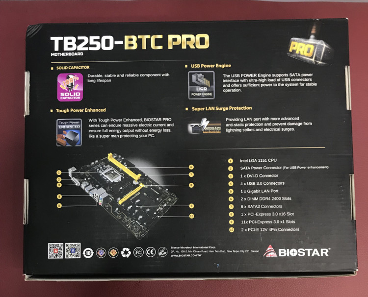 مادربرد TB250-BTC PRO یک محصول حرفه ای بر باپه چیپست پرطرفدار B250 اینتل است. این محصول از سوکت LGA-1151 بهره می برد و بنابراین، طیف وسیعی از پردازنده های متوسط تا قدرتمند اینتل بر روی آن قابل استفاده است. همچنین، دو شکاف حافظه DDR4 با فرکانس 2400 مگاهرتز، امکان استفاده از 32 گیگابایت حافظه پرسرعت را به صورت دو کاناله برای این سیستم فراهم می آورد. بر روی این مادربرد، 1 شکاف PCI-e 16x و 11 شکاف PCI-e 1x وجود دارد که جمعا بهره گیری از 12 دستگاه جانبی مبتنی بر رابط PCI-e را میسر می کند. یکی از ویژگیهای اصلی و برجسته این مادربرد، استفاده از چیپست B250 در مقایسه با محصولات مبتنی بر چیپست H110 است که در آن، کلیه مسیرهای PCI-e به طور مستقیم با چیپست اصلی مادربرد در ارتباط هستند و از روش های نامتعارف مثل استفاده از چیپ های جانبی برای افزایش تعداد مسیرهای PCI-e (نظیر آنچه در محصولات مبتنی بر چیپست H110 می بینیم) استفاده نشده است. این کار میزان پایداری سیستم را به طرز قابل توجهی بهبود بخشیده و از بروز ناهماهنگی در میان قطعات سخت افزاری و ناپایدار شدن سیستم جلوگیری می کند.